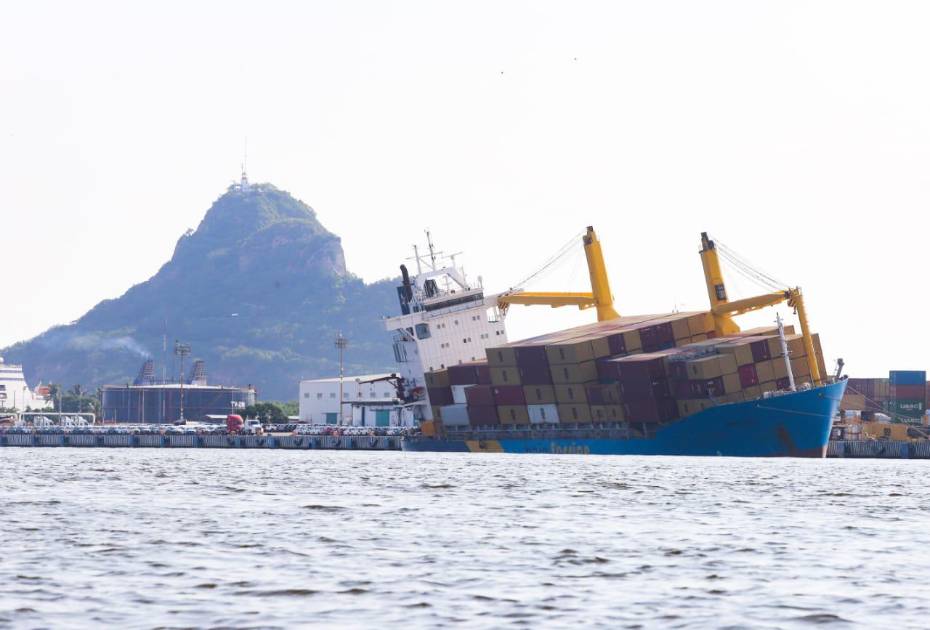 MAZATLÁN._ A casi 48 horas, el Buque Carguero Chiapas Star se mantiene escorado: así es la vista después de casi tres días desde la Isla de la Piedra.