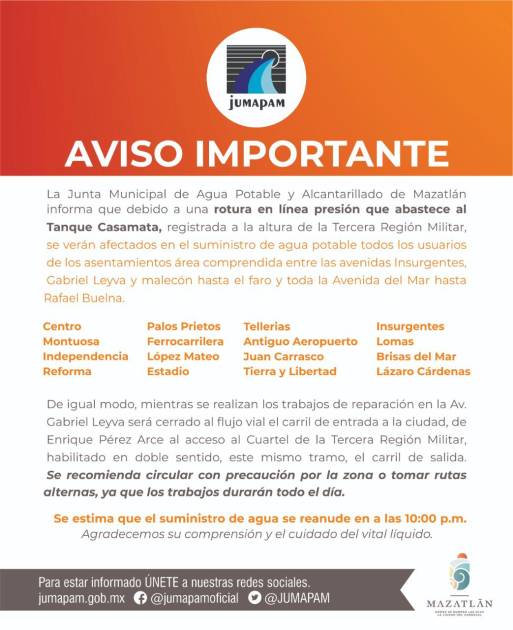 La Junta Municipal de Agua Potable y Alcantarillado de Mazatlán informó que, debido a una rotura en una línea de presión que abastece el Tanque Casamata, registrada a la altura de la Tercera Región Militar, se verán afectados en el suministro de agua potable varios sectores del puerto.