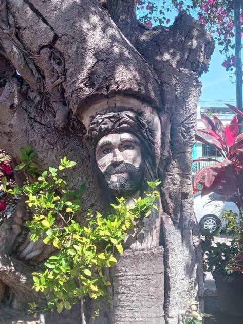 MAZATLÁN._ Turistas nacionales y extranjeros siguen tomándose fotografías del recuerdo con la imagen de Cristo tallada en el 2022 en un árbol de hule que se encuentra en el costado poniente del atrio de la Catedral Basílica de la Inmaculada Concepción, en este puerto.