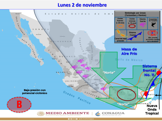 Precisó que para este día se prevén temperaturas máximas de 35 a 40 grados Celsius en Baja California Sur, Sonora, Sinaloa, Nayarit, Michoacán y Guerrero.