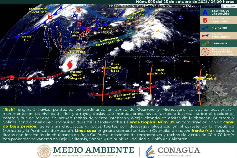 Las lluvias provocadas por Rick pueden originar deslaves, incremento en los niveles de ríos y arroyos, y desbordamientos e inundaciones en zonas bajas, por lo que el SMN de la Conagua exhorta a la población de los estados mencionados a extremar precauciones y atender las indicaciones de las autoridades del Sistema Nacional de Protección Civil en cada entidad.