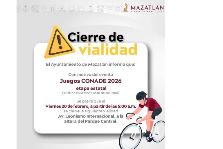 MAZATLÁN._ La Secretaría de Seguridad Pública Municipal, a través de la Unidad de Vialidad, informó que debido a la prueba de Triatlón en modalidad de ciclismo, de la etapa estatal de la Olimpiada Nacional de la Conade 2026, la circulación sobre la Avenida Leonismo Internacional se verá afectada la mañana de este viernes 20 de febrero.