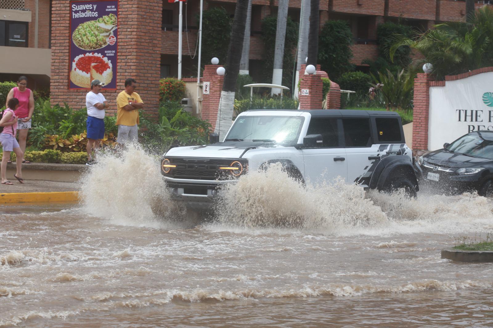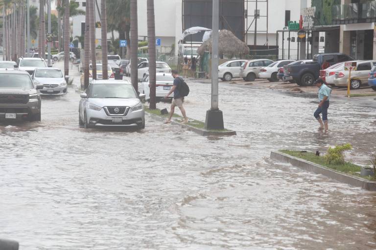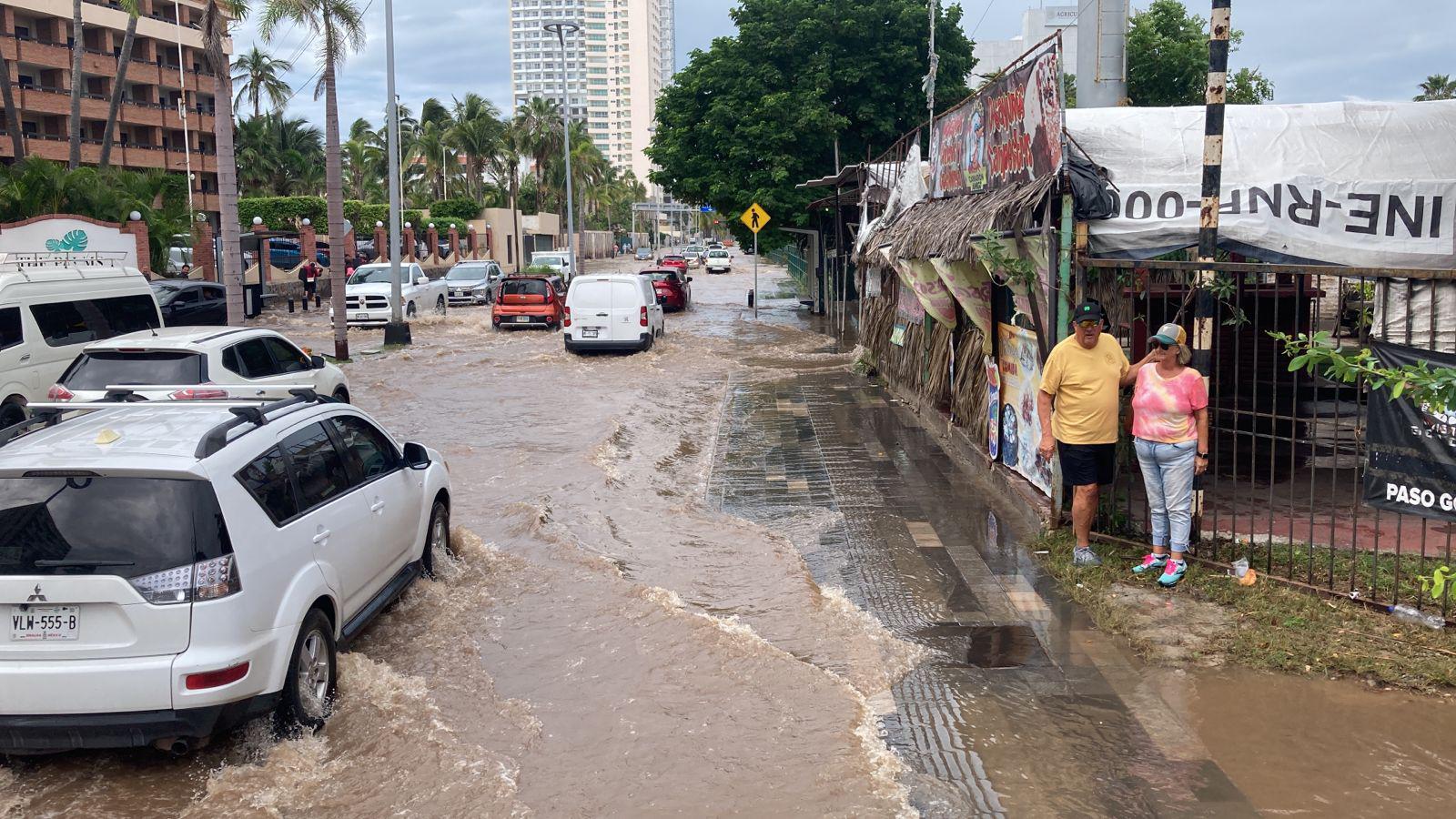 Desde la altura del centro nocturno Bansky hasta alrededor del restaurante Chile’s Pepper, la avenida Camarón Sábalo se encuentra inundada por las fuertes lluvias.