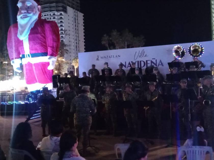 MAZATLÁN._ La Banda de Música de la Tercera Región Militar deleitó este jueves con villancicos, canciones navideñas y música popular regional a decenas de asistentes a la Villa Navideña, en el Parque Central de Mazatlán.