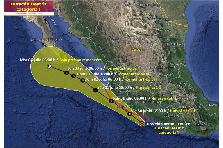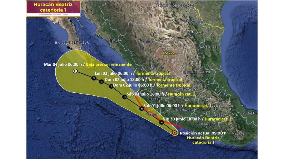 “Beatriz” se intensificó esta mañana a huracán categoría 1 y se localizó entre Guerrero y Michoacán; podría generar lluvias fuertes el fin de semana en Sinaloa.