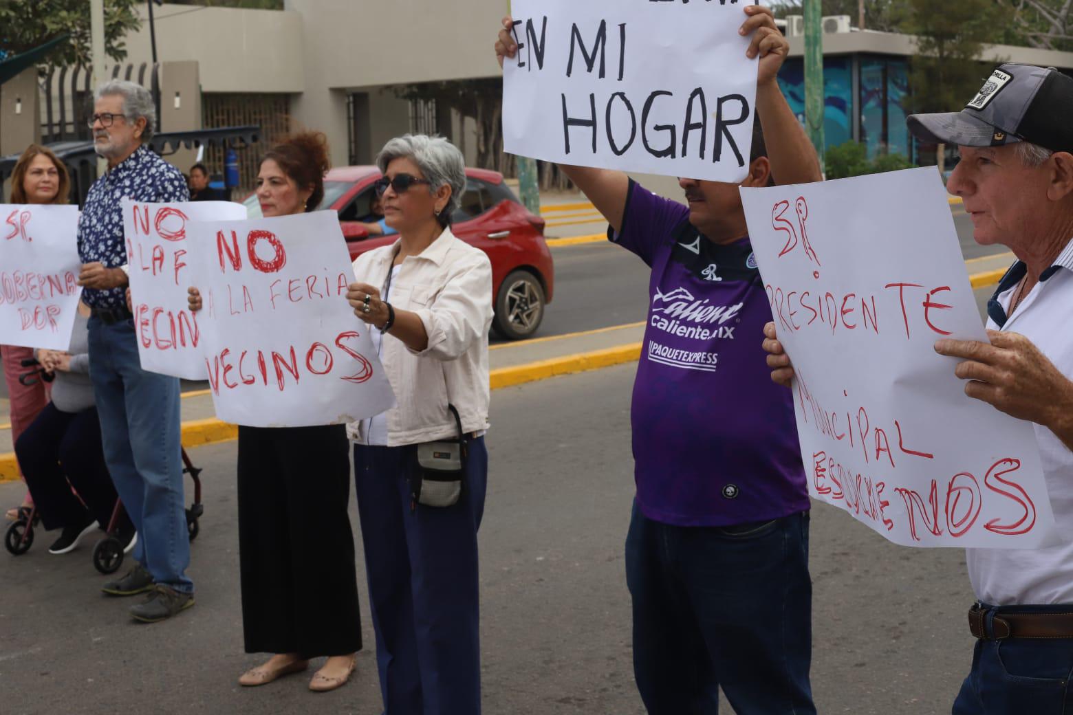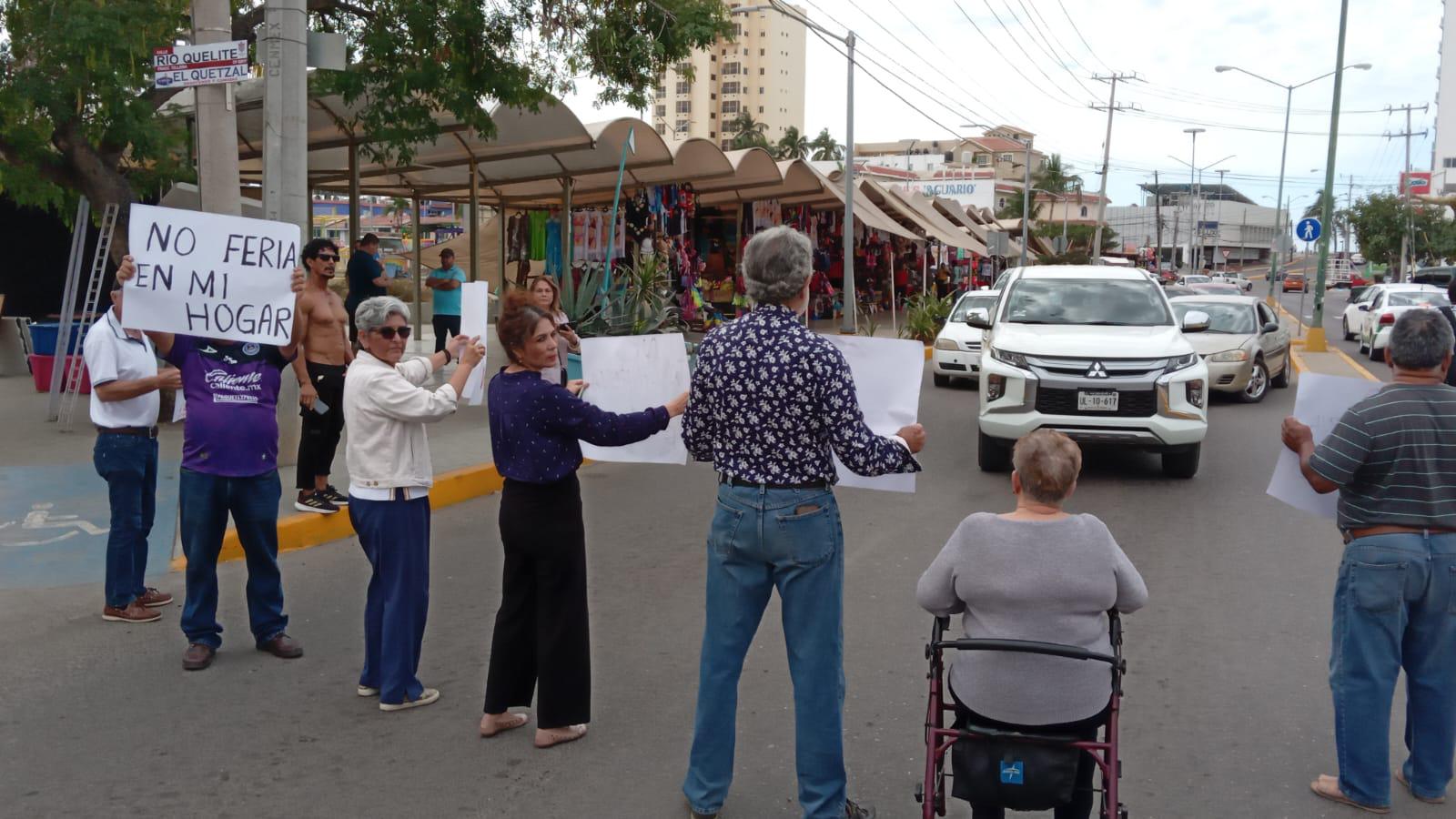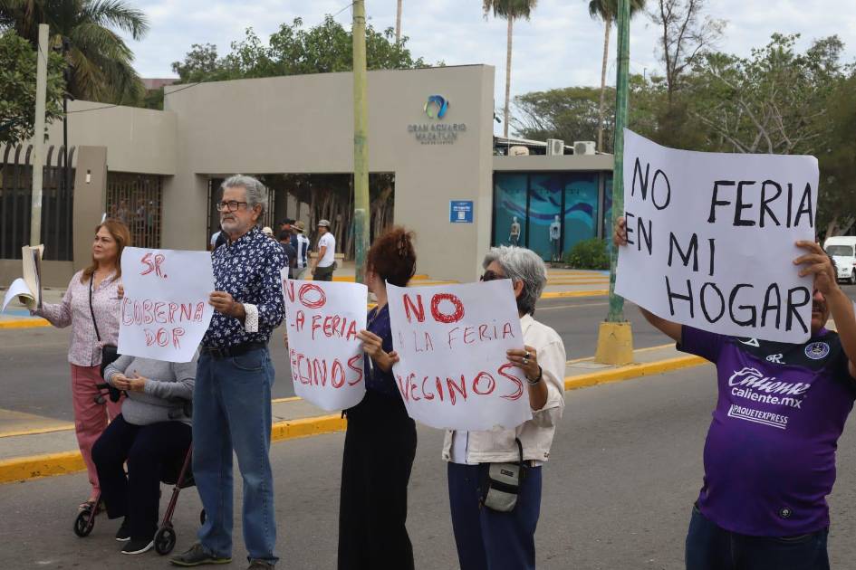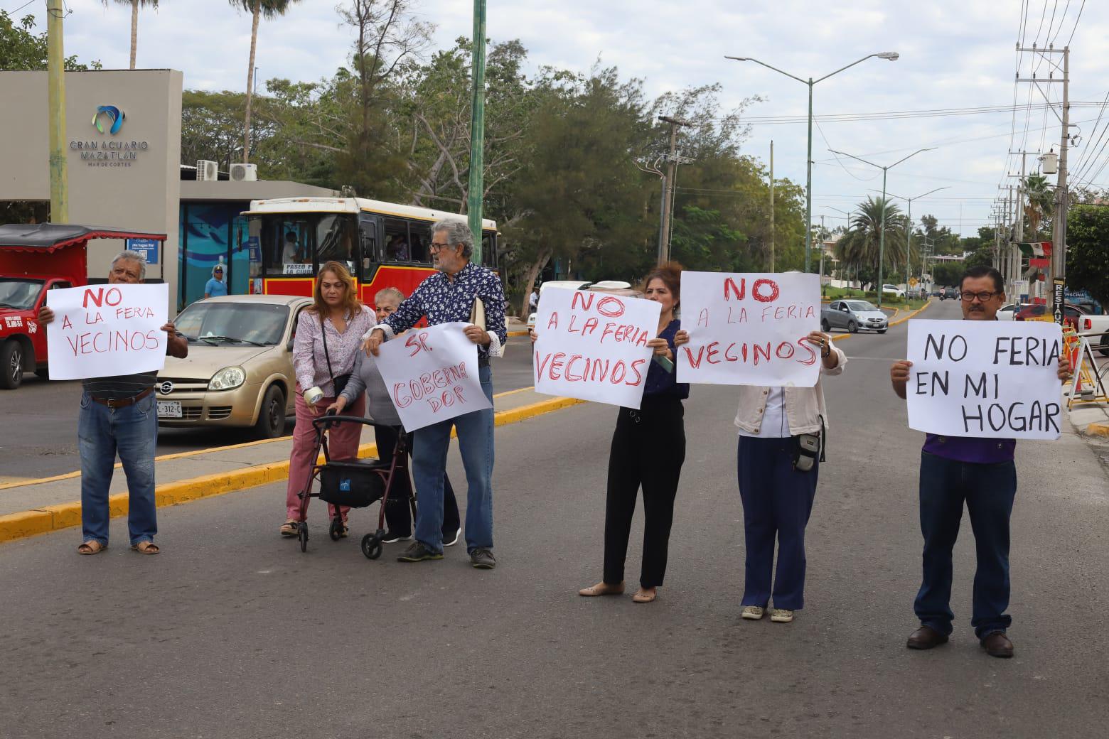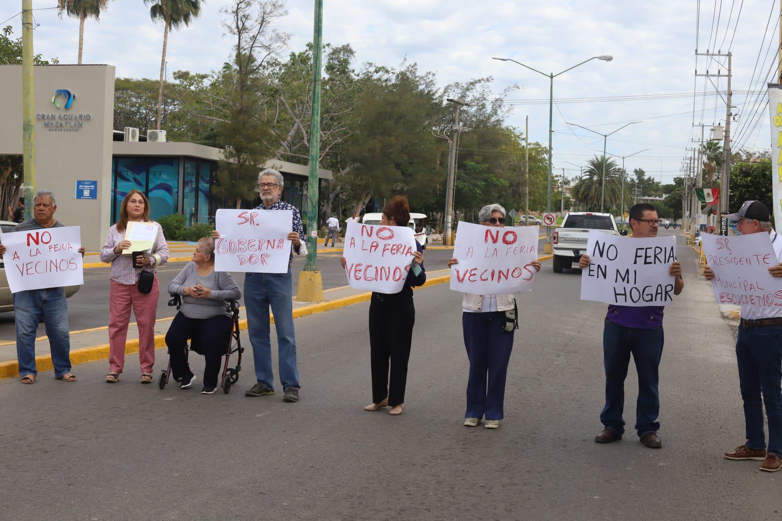 MAZATLÁN._Vecinos del Fraccionamiento Tellerías se manifestaron de manera pacífica contra la Feria del Carnaval, la mañana de este viernes, la cual se instaló en el estacionamiento que está enfrente del Acuario de Mazatlán.