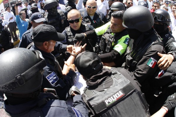 Los taxistas se enfrentaron de manera verbal con los policías y les arrojaron botellas con agua, pedazos de hielo, por lo que en total se sometió por la fuerza y se arrestó a otros nueve taxistas, para sumar 11 en total.