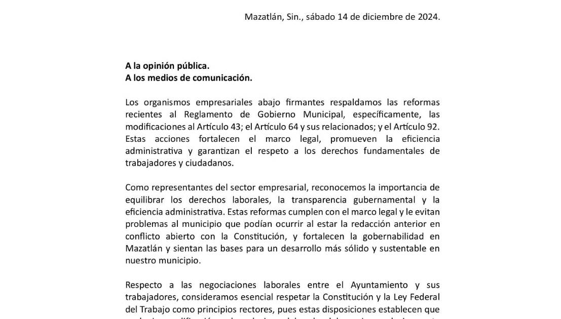 “Estas reformas cumplen con el marco legal y le evitan problemas al municipio que podían ocurrir al estar la redacción anterior en conflicto abierto con la Constitución, y fortalecen la gobernabilidad en Mazatlán y sientan las bases para un desarrollo más sólido y sustentable en nuestro municipio”, se lee.