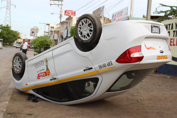 El pasado 22 de julio conductores de ecotaxis rojos y verdes voltearon una unidad de la CROC que mantenían bloqueada en la Avenida del Delfín, frente al Fraccionamiento Los Mangos, en este puerto.