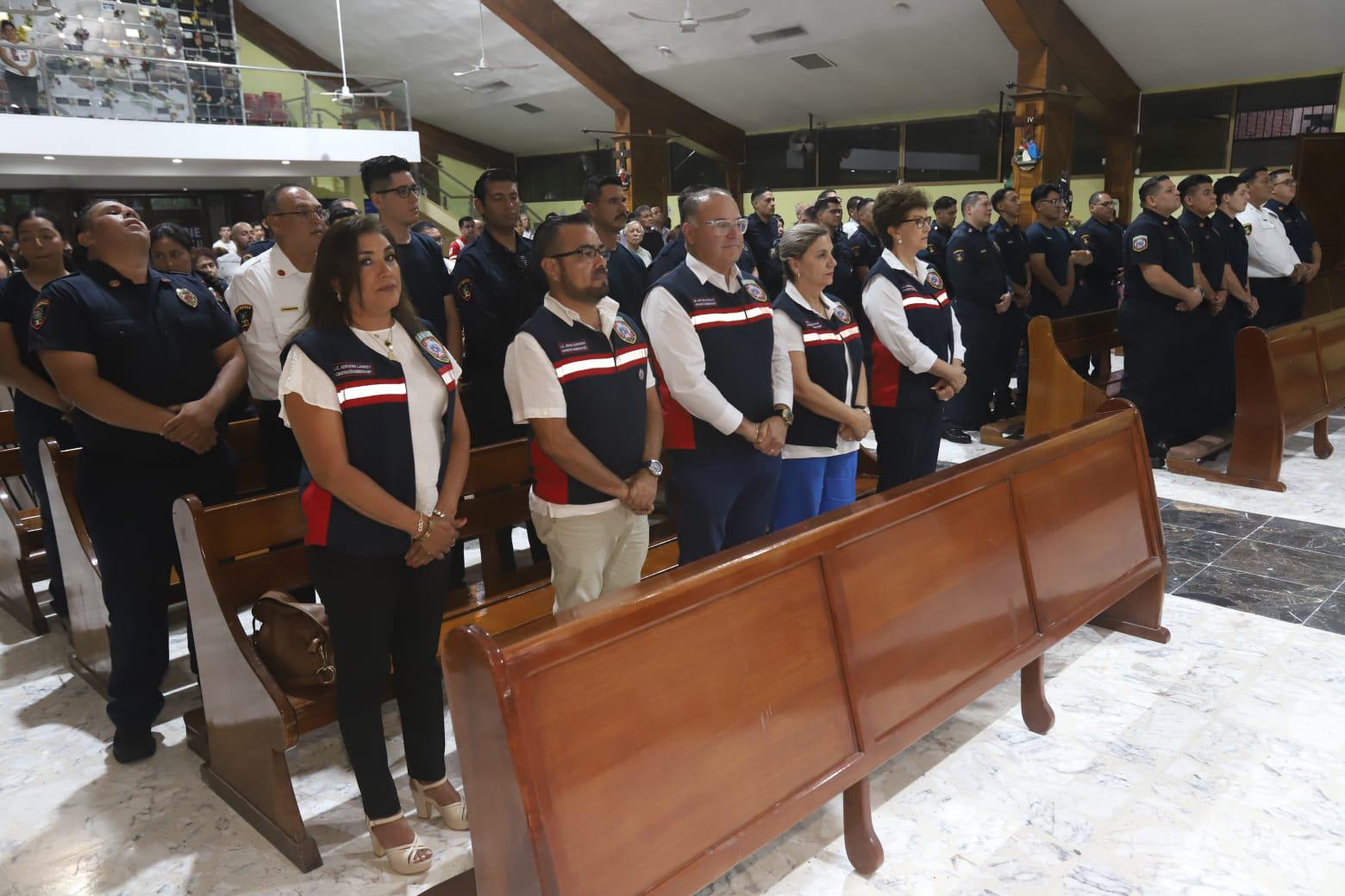 MAZATLÁN._ Como parte de la celebración por el Día Nacional del Bombero, se realizó una misa en la iglesia San Carlos Borromeo, donde el Cuerpo Voluntario de Bomberos de Mazatlán recibió la bendición del párroco Julio César Hernández Alcaraz.