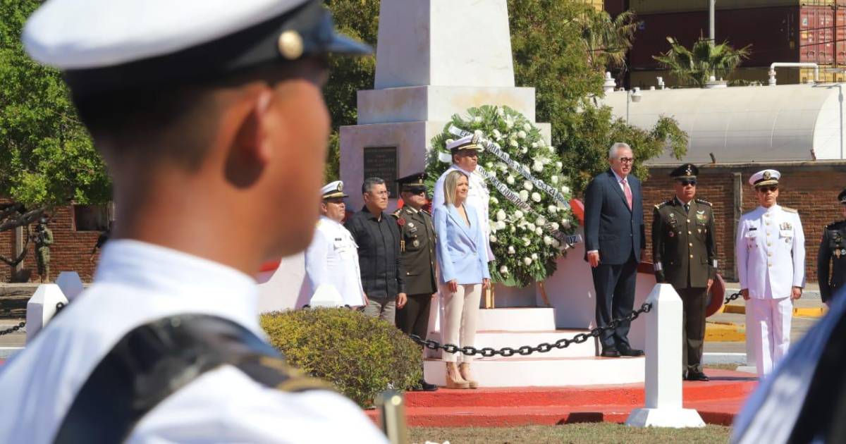 En la ceremonia también encabezada por el Comandante de la Tercera Región Militar, General de División de Estado Mayor, Guillermo Briseño Lobera, la Alcaldesa de Mazatlán, Estrella Palacios Domínguez y el Secretario de Seguridad Pública en Sinaloa, general Óscar Rentería, entre otros, las autoridades depositaron una ofrenda floral en el Obelisco a los Héroes del 21 de abril de 1914 y se realizó el Toque de Silencio y una salva de honor en su memoria.