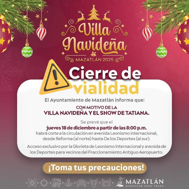 MAZATLÁN._ La Secretaría de Seguridad Pública Municipal, a través de la Unidad de Vialidad, informó que debido a los eventos en la Villa Navideña y a la presentación del show de Tatiana, la avenida Leonismo Internacional será cerrada a la circulación vehicular.