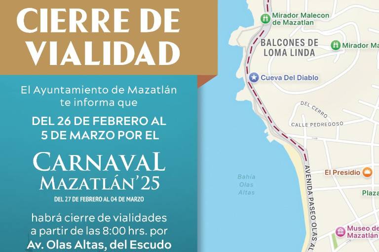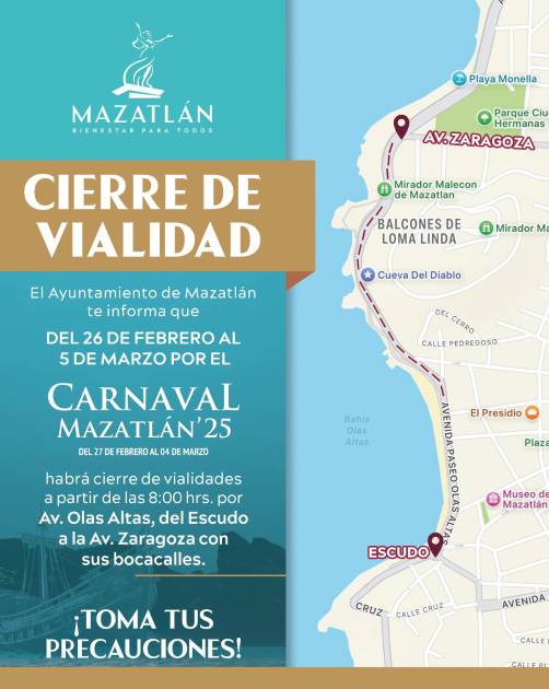 MAZATLÁN._ Debido a la realización de las fiestas del Carnaval Internacional de Mazatlán 2025, “La Perla”, la Secretaría de Seguridad Pública Municipal, a través de la Subdirección de Tránsito, informa sobre cierres viales desde la avenida Ignacio Zaragoza hasta las calles Carranza y Lewis, a un costado del Escudo de Sinaloa, a partir de mañana miércoles 26 de febrero, en punto de las 08:00 horas.