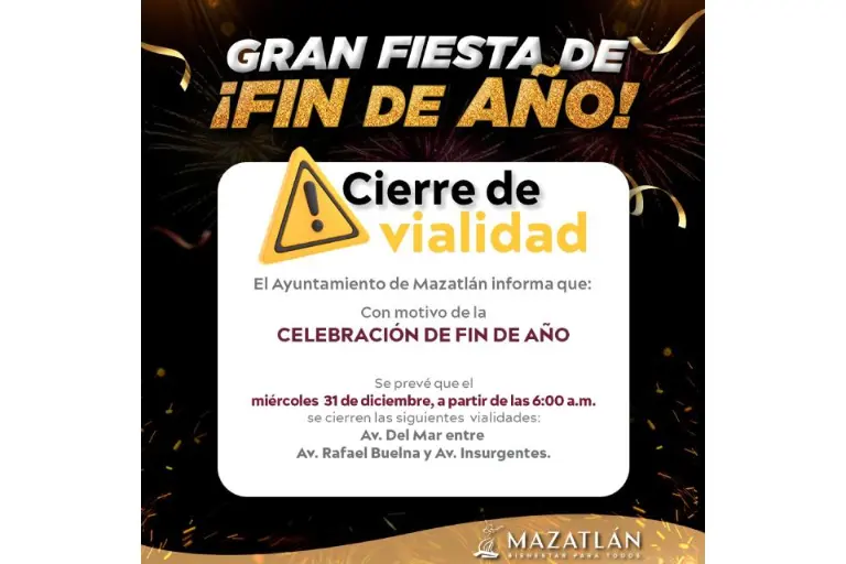 De acuerdo a un comunicado, Óscar García Peinado, subdirector de Tránsito Municipal, indicó que el cierre de circulación será sobre la Avenida del Mar, en el tramo comprendido entre Rafael Buelna e Insurgentes, inicialmente para la instalación del escenario y, posteriormente, por el evento de despedida de año, el cual contará con música en vivo, fuegos artificiales y un espectáculo de drones.