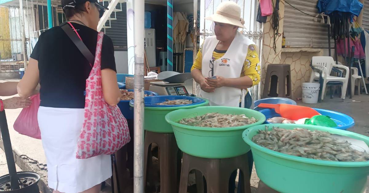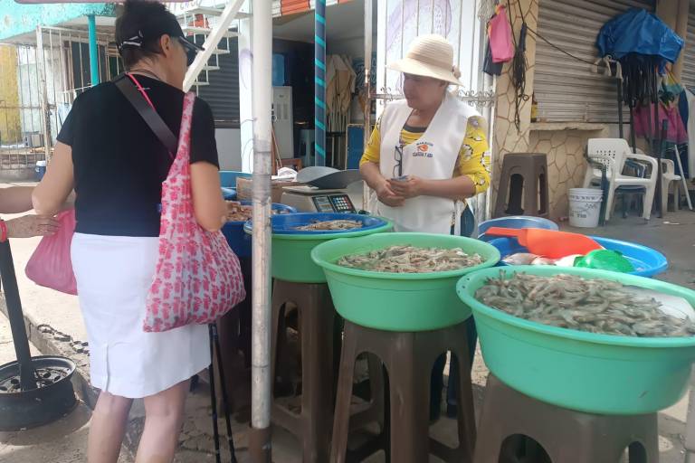 “Un cevichero está en 90, 100 pesos; un coctelero 160 pesos, que es un camarón descabezado, un camarón grande. El de coctel es de barco, y tenemos lo que es el ‘piojo’. Hay camarón azul, de altamar y tenemos lo que es el pulpo. Tenemos todo tipo de marisco aquí con las camaroneras”.