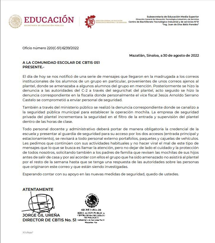 La tarde de este martes, la dirección del Cbtis 51 envió un comunicado sobre estos hechos.