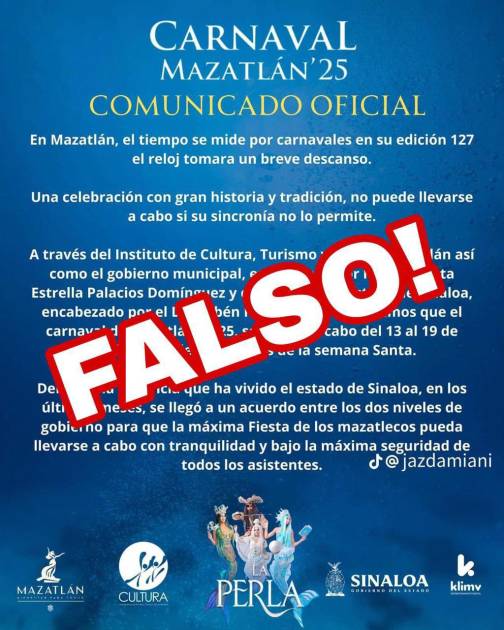 Un supuesto cambio de fecha del Carnaval Internacional de Mazatlán circula en las redes sociales como “comunicado oficial” de los gobiernos de Mazatlán y del Estado, pero es falso.