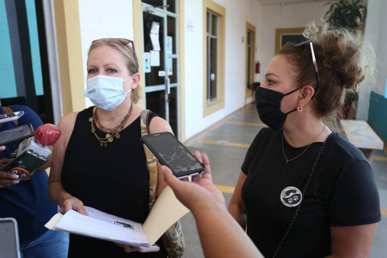 Fernanda Orrantia Waldegg y Yolanda López García se apostaron por más de dos horas a las afueras de las oficinas de Oficialía Mayor, para exigir que se informe de manera oficial que no hay permisos para la realización de una corrida de toros, peleas de gallos y exhibición de caballos que se anuncian, desde hace días, en redes sociales.