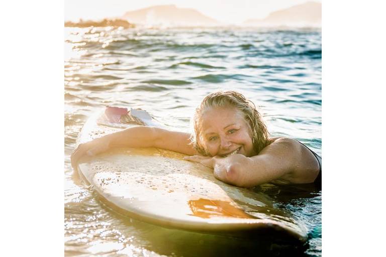 A las 6:00 horas se levanta -mientras la observa su gata Luna desde la ventana del patio- se sirve un café helado y con él camina media cuadra para ver si las olas son suficientemente buenas para surfear, y si no, tan solo camina en la playa o nada un poco. Así es casi todos los días.