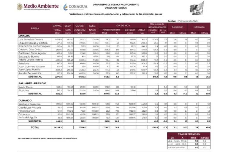Conagua advierte crítica escasez de agua en presas del norte y centro de Sinaloa