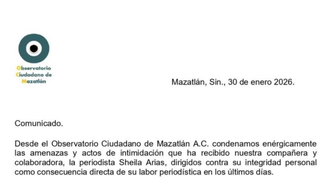 “Desde el Observatorio Ciudadano de Mazatlán A.C. condenamos enérgicamente las amenazas y actos de intimidación que ha recibido nuestra compañera y colaboradora, la periodista Sheila Arias, dirigidos contra su integridad personal como consecuencia directa de su labor periodística en los últimos días”, indicó.