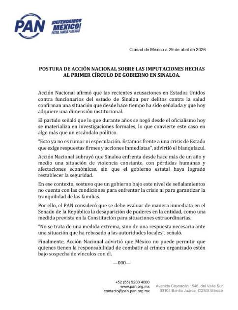 “Esto ya no es rumor ni especulación. Estamos frente a una crisis de Estado que exige respuestas firmes y acciones inmediatas”, advirtió el blanquiazul en un comunicado de prensa emitido este 29 de abril, horas después de que se hicieron públicos los señalamientos en contra del Gobernador de Sinaloa y otros funcionarios públicos en la entidad.