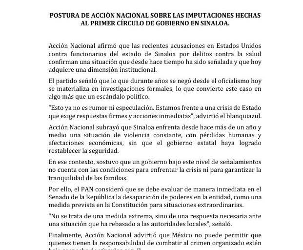 Las recientes acusaciones en Estados Unidos contra funcionarios del estado de Sinaloa por delitos contra la salud confirman una situación que desde hace tiempo ha sido señalada y que hoy adquiere una dimensión institucional, señaló el Partido Acción Nacional.