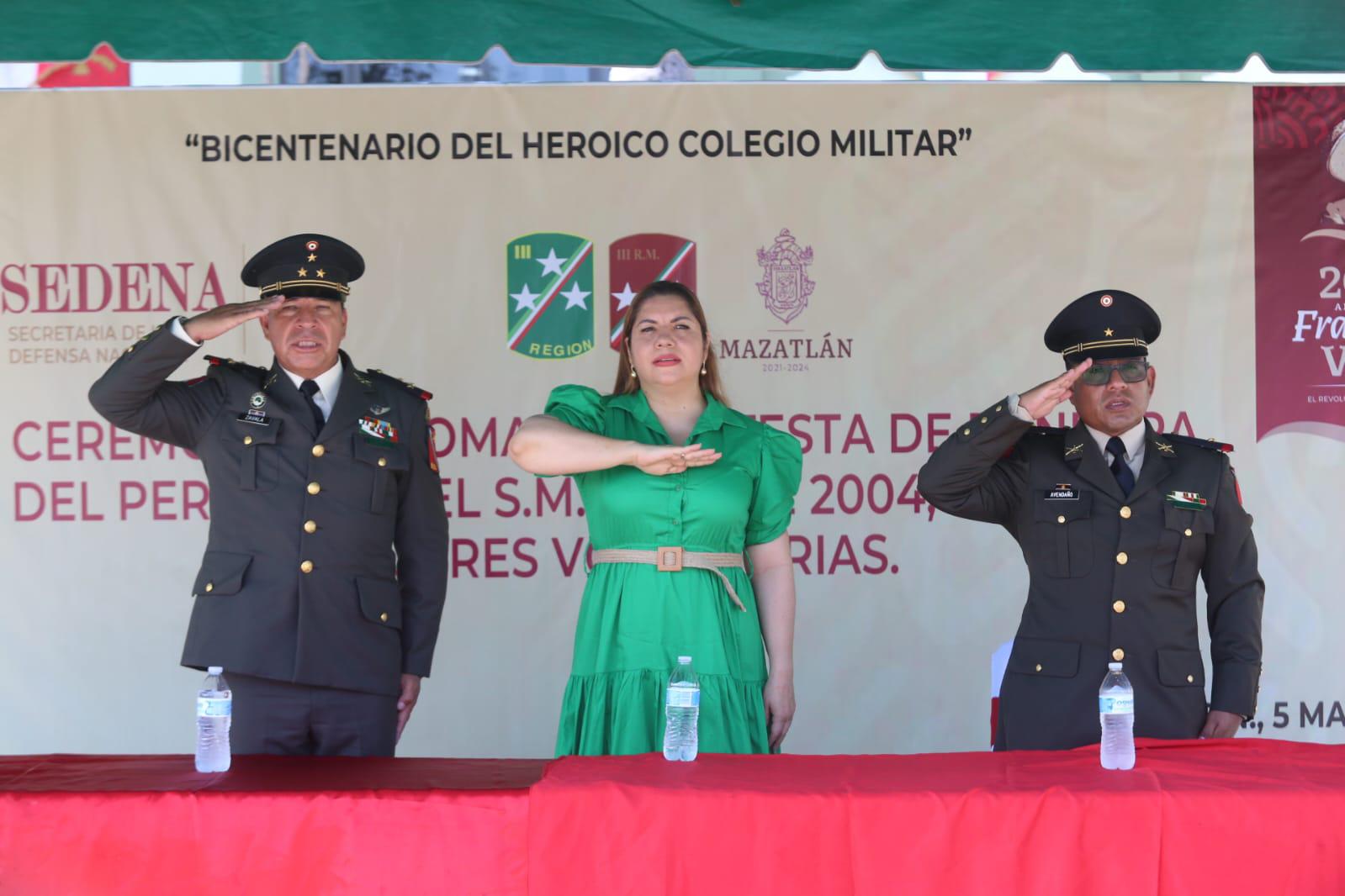 Correspondió al Coronel Zavala Barrera tomar la protesta de Bandera a los integrantes de la Clase 2004, remisos y mujeres voluntarias del SMN, en total 600 del sur de Sinaloa que cumplieron con esa obligación tanto encuadrados acudiendo cada sábado como en disponibilidad.