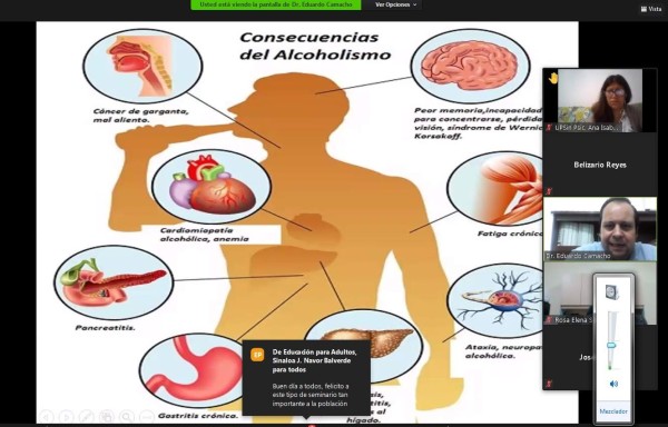 En su intervención en la inauguración de la 26 Semana Nacional Compartiendo Esfuerzos "La epidemia de Consumo de Alcohol en la crisis de Covid-19", que se realiza vía Zoom de hoy al 31 del presente mes, el doctor de Uneme Capa Mazatlán expuso el tema "Daños a la Salud por el consumo de alcohol" en la que manifestó que el alcoholismo es sin duda algo que viene a traer mayores repercusiones en la salud, pues el alcohol es una droga legal en México y la droga es una sustancia natural o sintética que al ser introducida en el organismo actúa sobre el sistema nervioso central y modifica una o varias de sus funciones físicas o psíquicas como la percepción, el estado de ánimo, la conducta entre otras.