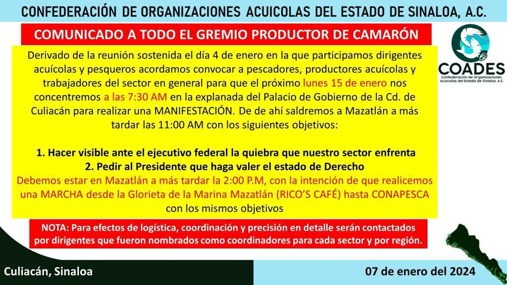 La Confederación de Organizaciones Acuícolas del Estado de Sinaloa convocó a todo el gremio productor de camarón a participar en una manifestación que se realizará este lunes 15 de enero en Culiacán, para posteriormente trasladarse a Mazatlán.