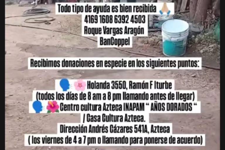 La vocera subrayó la importancia de los donativos materiales: “No hemos recibido prácticamente nada, todavía se necesita todo, sobre todo materiales para casas provisionales, lona, alambre, madera, prácticamente lo que se tenga.”