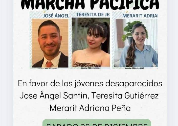 MAZATLÁN._ Familiares y amigos de los jóvenes desaparecidos José Ángel Satín, Teresita Gutiérrez y Merarit Adriana Peña, convocaron a una marcha pacífica este sábado 28 de diciembre, sobre el Malecón de Mazatlán.