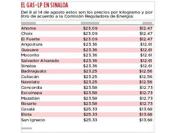 Para Angostura, Guasave, Mocorito, Salvador Alvarado y Sinaloa será de $23.36 por kilo con IVA, y de 12.61 por litro con IVA.