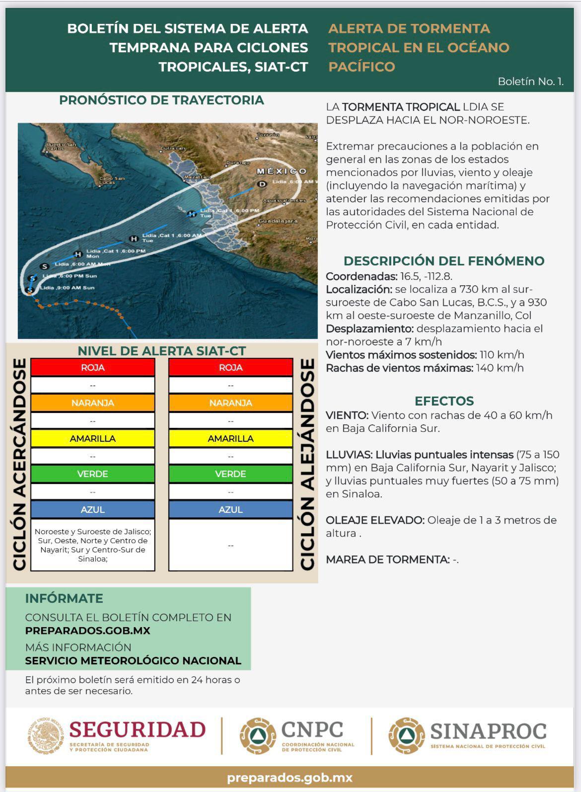 Por su parte, el Sistema de Alerta Temprana para Ciclones Tropicales (SIAT-CT), informó en su aviso 1, que “Lidia” se localizaba este domingo a 730 kilómetros al sur- suroeste de Cabo San Lucas, Baja California Sur, y a 930 kilómetros al oeste-suroeste de Manzanillo, Colima; desplazándose hacia el Nor-Noroeste a 7 kilómetros por hora, con vientos máximos sostenidos de 110 kilómetros por hora y rachas de vientos máximas de hasta 140.