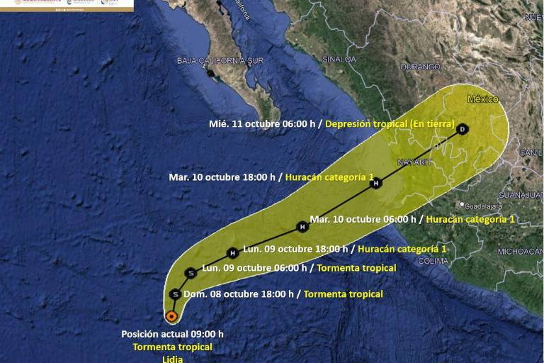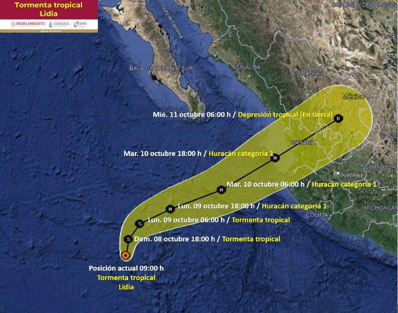 “Lidia” provocará rachas de viento de 40 a 60 km/h en Baja California Sur; lluvias puntuales intensas (75 a 150 mm) en Baja California Sur, Nayarit y Jalisco; y lluvias puntuales muy fuertes (50 a 75 mm) en Sinaloa; así como un oleaje de 1 a 3 metros de altura.
