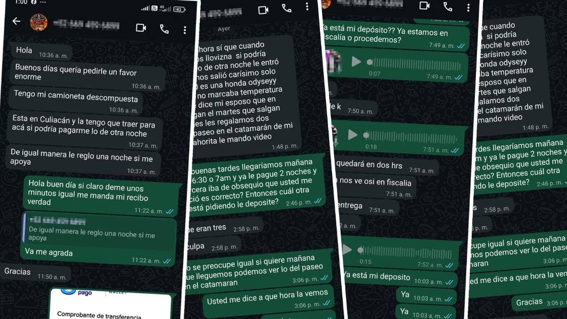 “Después me dijeron que tenían un problema con su camioneta y me pidieron depositar otra noche. Me ofrecieron regalarme una noche más si les ayudaba con ese pago por la supuesta urgencia”, declaró.