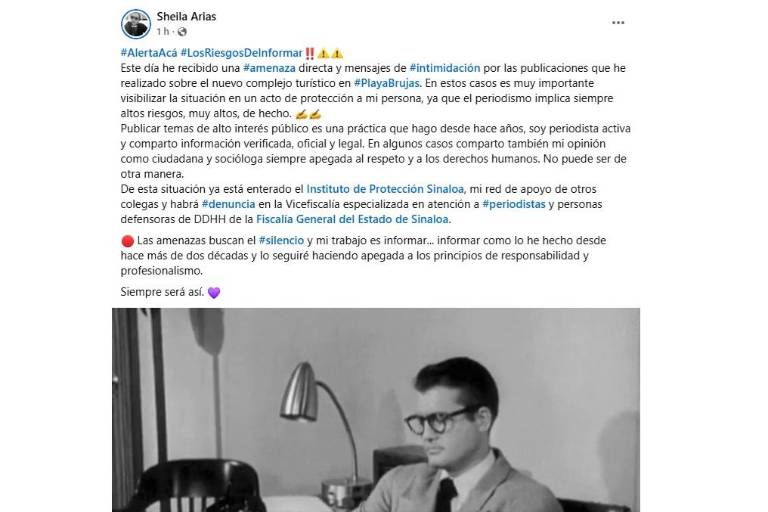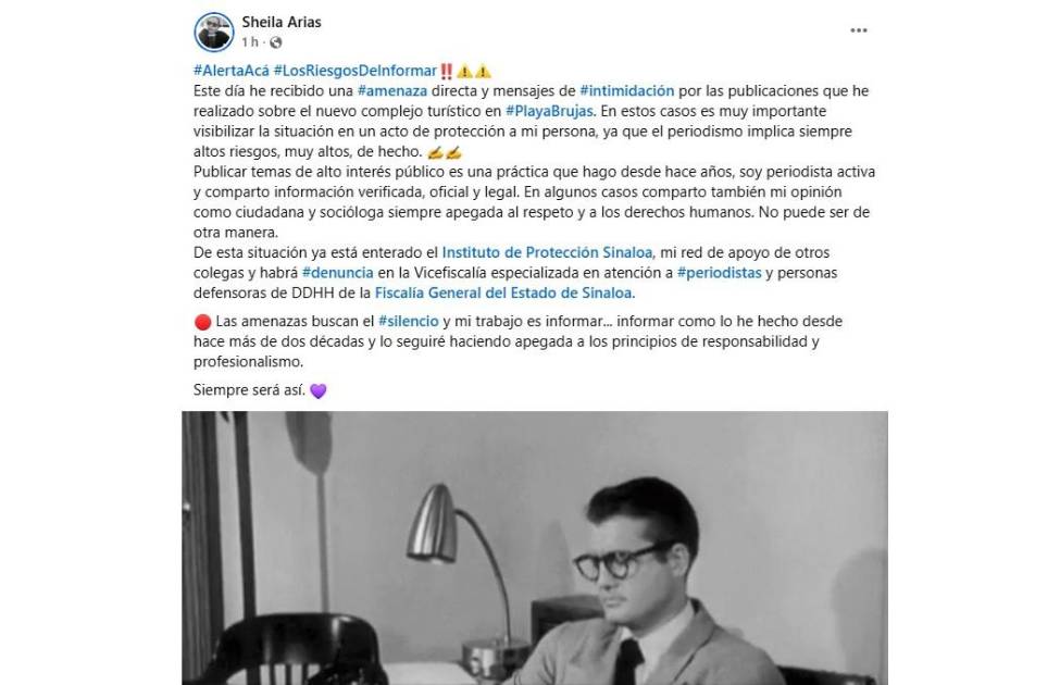 Una amenaza directa y mensajes intimidatorios en su contra denunció públicamente la periodista Sheila Arias por publicaciones que realizó en sus redes sociales de un complejo turístico que se contempla construir en Playa Brujas, al norte de Mazatlán.