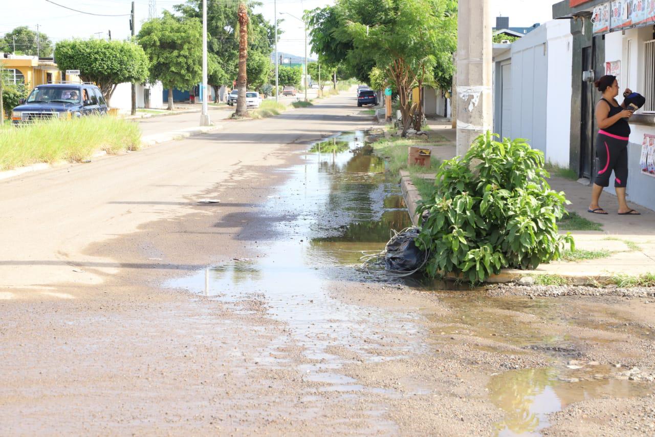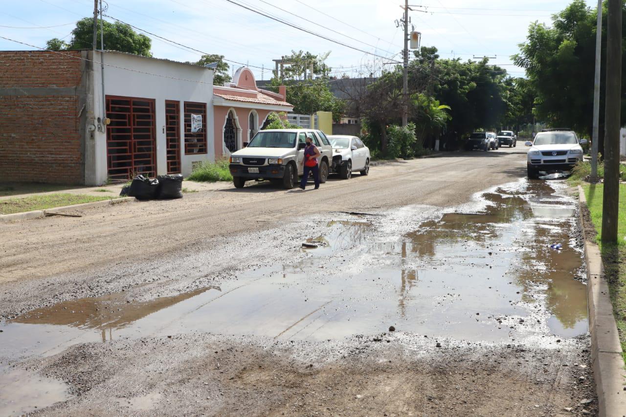 Denuncian baches y fugas de agua en San Joaquín, en Mazatlán; Ayuntamiento solo le echa tierra a los hoyos, dicen vecinos