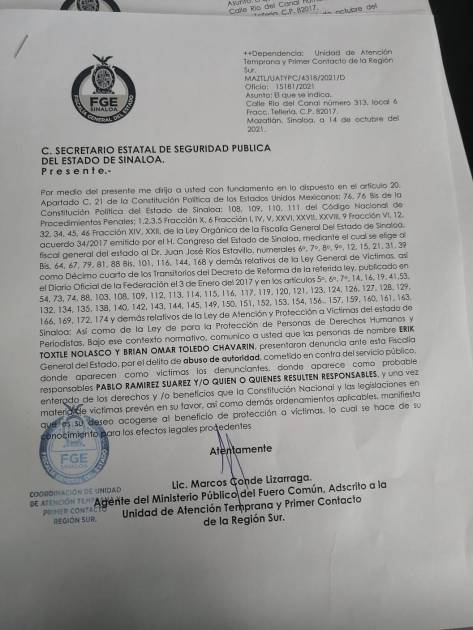 “Comunico a usted que las personas de nombre ERIK TOXTLE NOLASCO Y BRIAN OMAR TOLEDO CHAVARIN, presentaron denuncia ante esta Fiscalía General del Estado, por el delito de abuso de autoridad, cometido en contra del servicio público”, se lee en la denuncia.