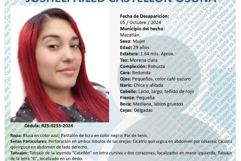 MAZATLÁN._ La joven Josheli Ailed Castellón Osuna, de 29 años, se encuentra desaparecida desde alrededor de las 03:00 horas del pasado sábado 5 de octubre, cuando fue vista por última vez en Colonia Villas del Sol, en Mazatlán.