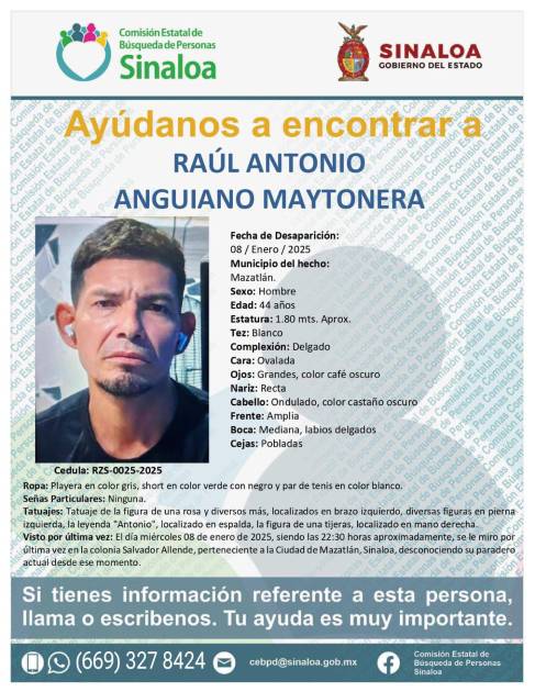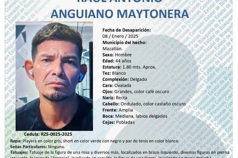 MAZATLÁN._ Raúl Antonio Anguiano Maytonera, de 44 años de edad. se encuentra desaparecido desde el pasado miércoles 8 de enero, cuando fue visto por última vez a las 22:30 horas, en la Colonia Salvador Allende.