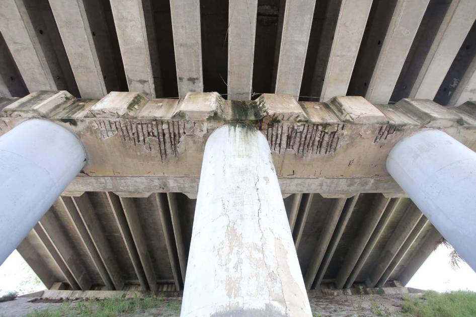 Por encima y a la vista de todos, los puentes parecen estar en buen estado, pero por debajo, los pilares se encuentran fragmentados, los trabes y las columnas tienen las varillas por fuera, especialmente en el primer puente, el más próximo a Zona Dorada.