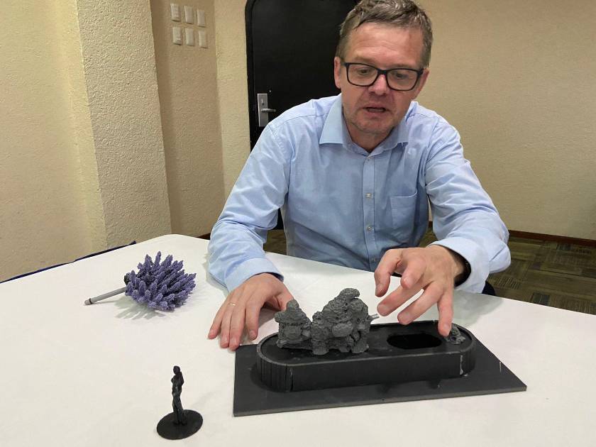 Møller muestra una pequeña maqueta donde vivirán serpientes de mar que estarán moviéndose alrededor de los espectadores, que entrarán a su tanque y quedarán en medio de ellos con total seguridad.