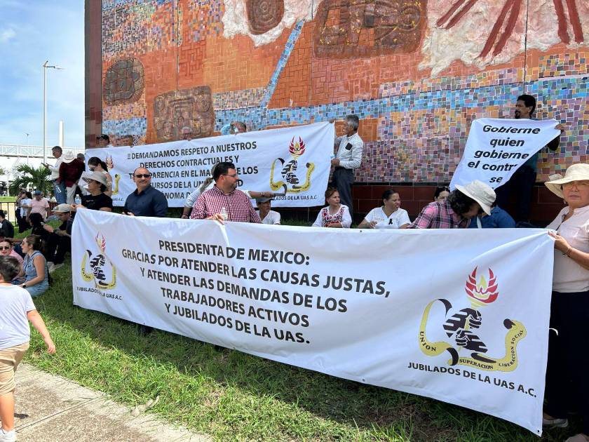 MAZATLÁN._ Aprovechando la visita de la Presidenta Claudia Sheinbaum Pardo a Mazatlán, docentes jubilados de la Universidad Autónoma de Sinaloa realizaron una nueva protesta para mostrar su inconformidad ante la llamada “reingeniería” propuesta por el Rector Jesús Madueña Molina, a la cual tachan de inválida.