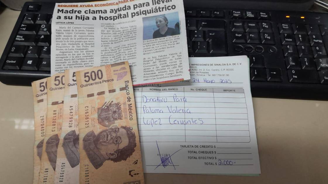 El donativo de 2 mil pesos fue recibido en las instalaciones de Noroeste y será entregado este lunes a María del Carmen.