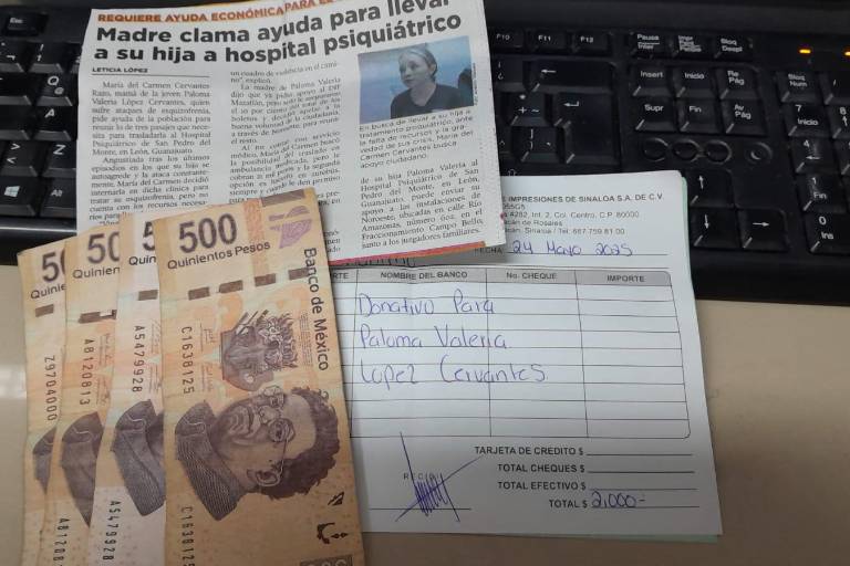 MAZATLÁN._ Un donativo de 2 mil pesos fue enviado por la fiel lectora anónima de Noroeste para María del Carmen Cervantes Razo, mamá de la joven Paloma Valeria López Cervantes, quien sufre ataques de esquizofrenia. Clama ayuda de la población para reunir lo de tres pasajes que necesita para trasladarla al Hospital Psiquiátrico de San Pedro del Monte, en León, Guanajuato.