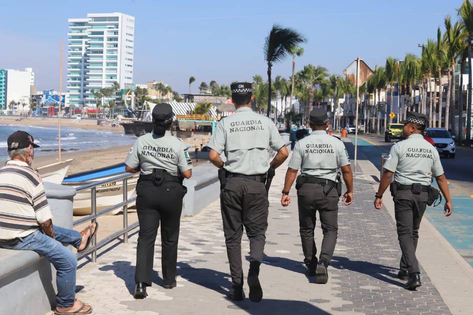 En busca de hacer sentir más paz y tranquilidad a la ciudadanía mazatleca, varios elementos de la Guardia Nacional patrullan a pie las zonas turísticas y avenidas aledañas de la ciudad, mientras que los carros de la Policía Municipal realizan recorridos por el malecón.