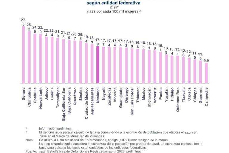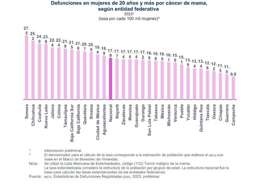 En 2023, a nivel nacional, por cada 100 mil mujeres de 20 años y más, la tasa de mortalidad por cáncer de mama fue de 17.9. Entre las entidades, Sonora registró la tasa más elevada con 27.5, seguida por Chihuahua con 25.2, mientras que las tasas más bajas se ubicaron en Campeche con 9.9 y Guerrero con 11.0.