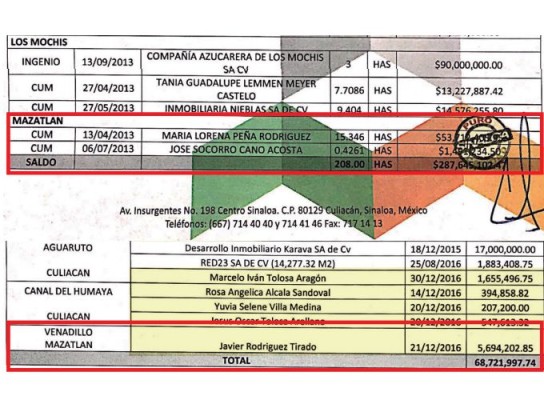 De acuerdo con información en poder de Noroeste, por medio de una solicitud de transparencia (folio 01470218), el más grande de los terrenos ocupa una superficie de 15.346 hectáreas. Fue comprado a María Lorena Peña Rodríguez por 53 millones 712 mil 405.95 pesos, el 13 de abril de 2013.