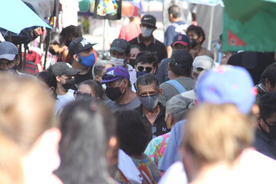 MAZATLÁN._ A unas horas de que Sinaloa regrese al color rojo en el Semáforo Epidemiológico por los altos contagios de Covid-19, en el Tianguis dominical de la Colonia Benito Juárez la sana distancia no siempre se respeta.